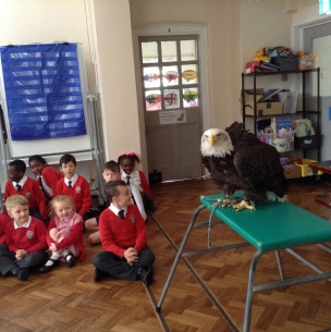 Today children who secured excellent attendance for the Spring term were awarded with a visit from two birds of prey! Chris from Eagle Heights brought in a Barn Owl called Chippy and a Bald Eagle called Kaley.